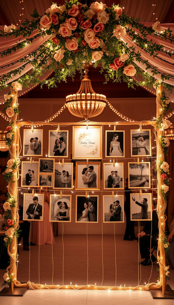 A photo wall is a meaningful and emotional decoration idea. Display pictures of the couple, family memories, or engagement moments.